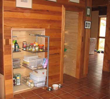 Downstairs in the kitchen, the problem hole now has two pull-out sets of shelves.